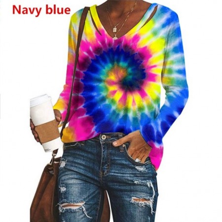 New Women's V-Neck Tie-Dye Printing Long-Sleeved Loose Top T-Shirt